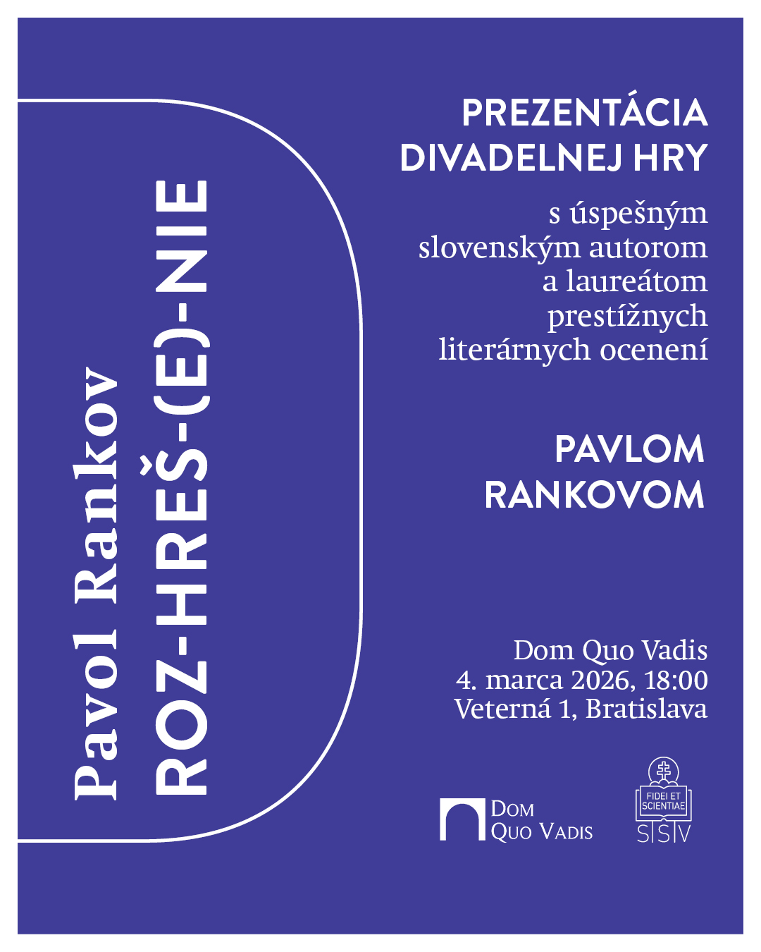 Spolok svätého Vojtecha a Dom Quo Vadis pozývajú na prezentáciu novej divadelnej hry Roz-hreš-(e)-nie od slovenského spisovateľa Pavla Rankova, ktorá sa uskutoční 4. marca o 18.00 hod. v Dome Quo Vadis v Bratislave.